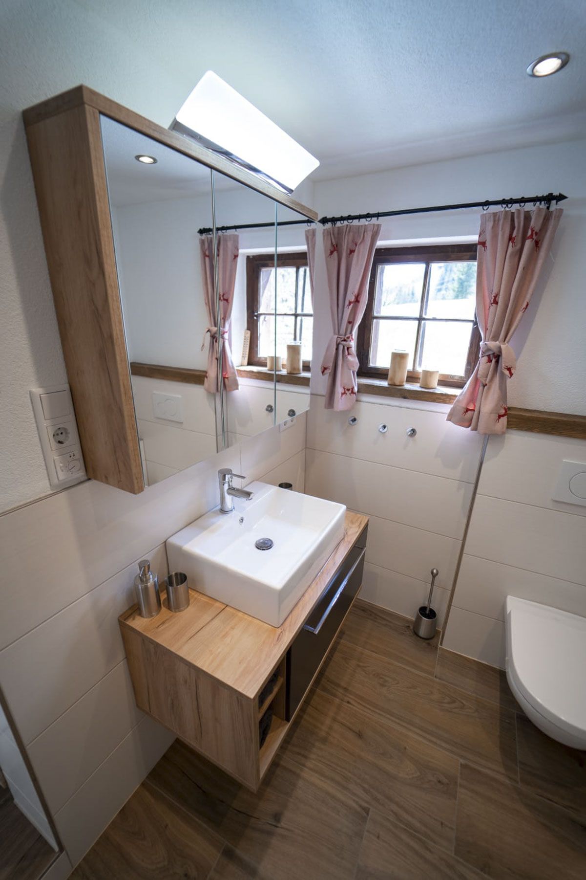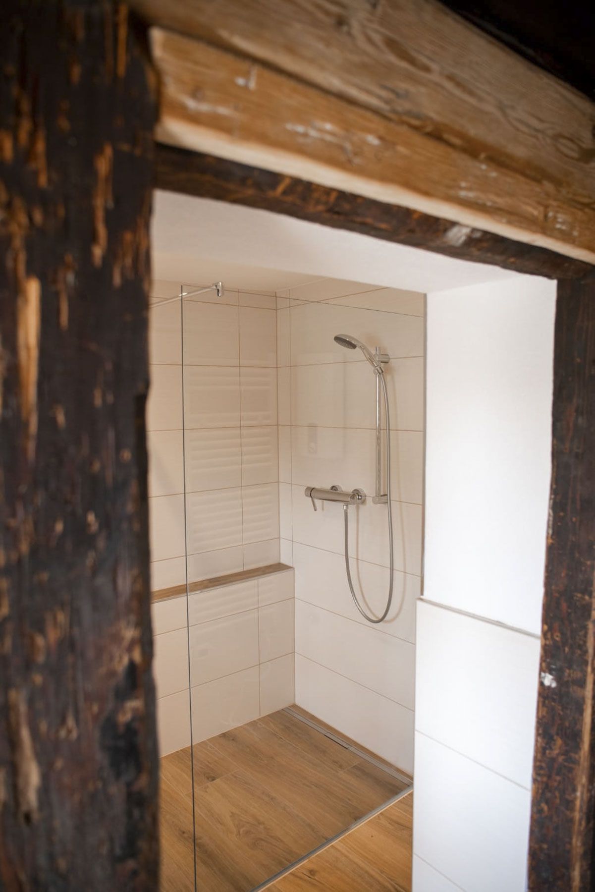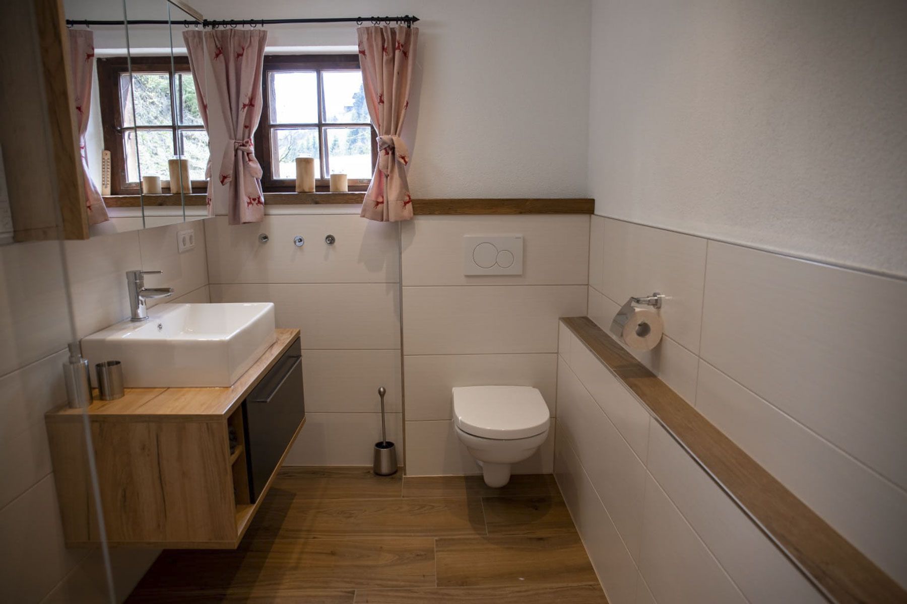 1 Badezimmer mit Dusche, Waschbecken, WC und Fußbodenheizung