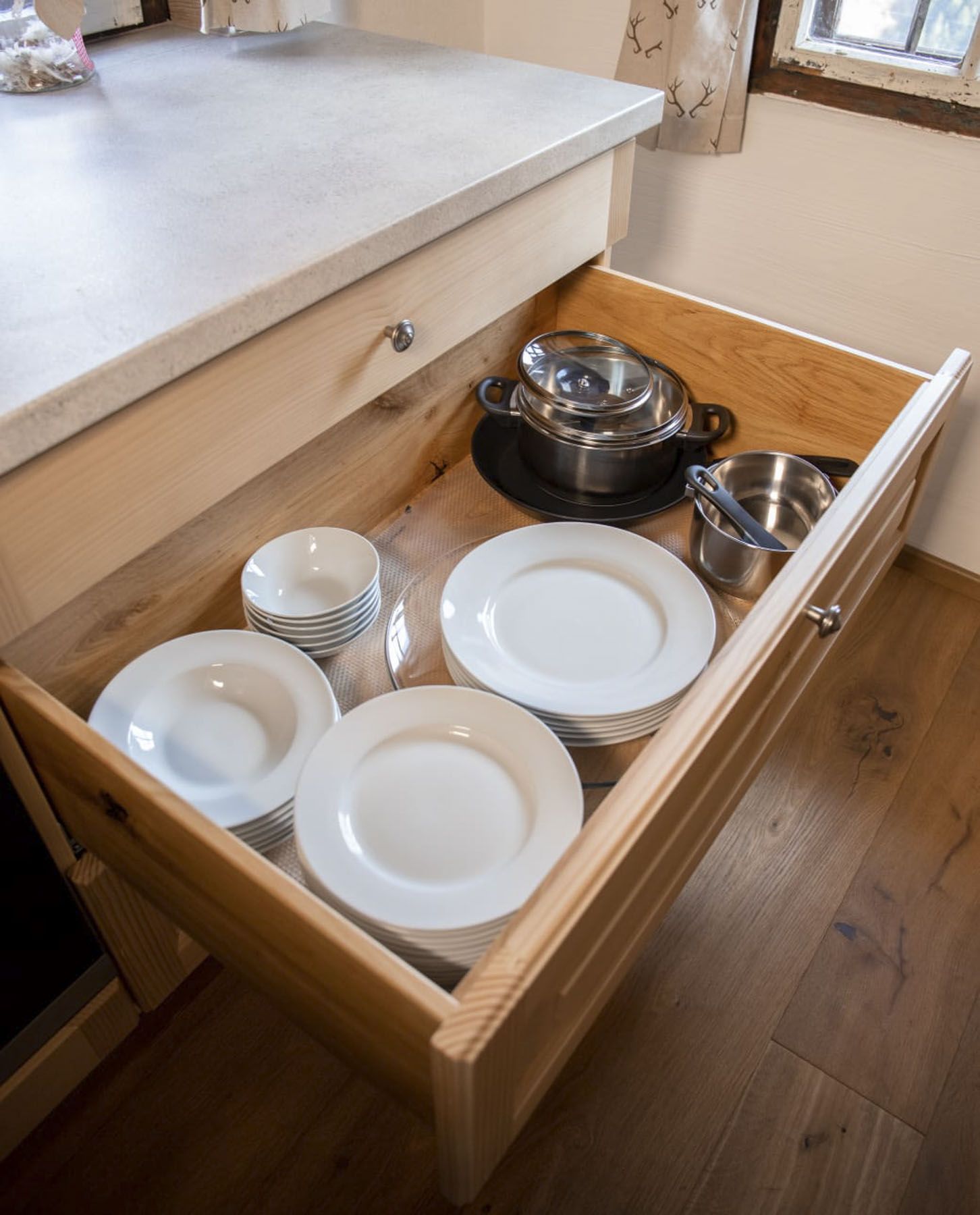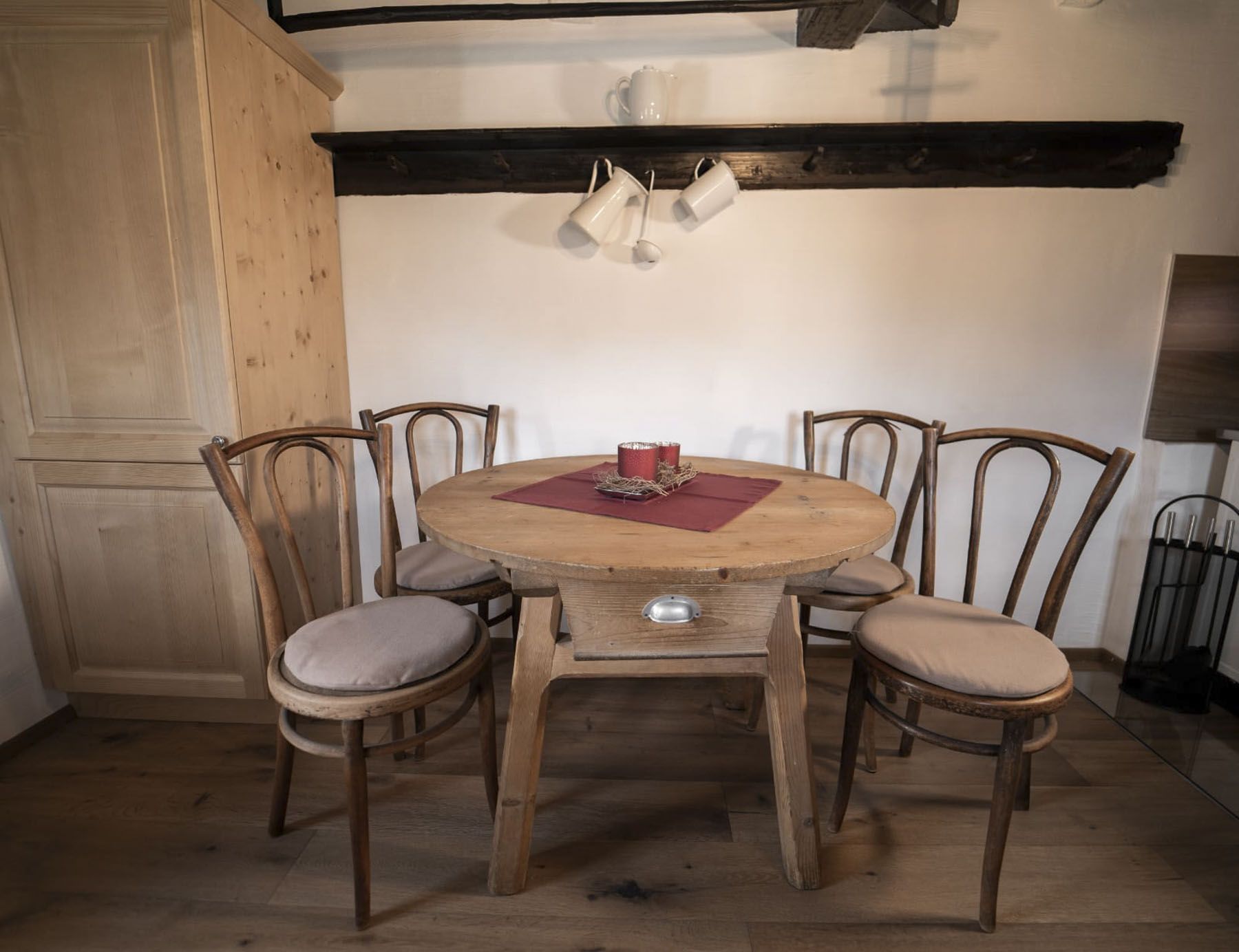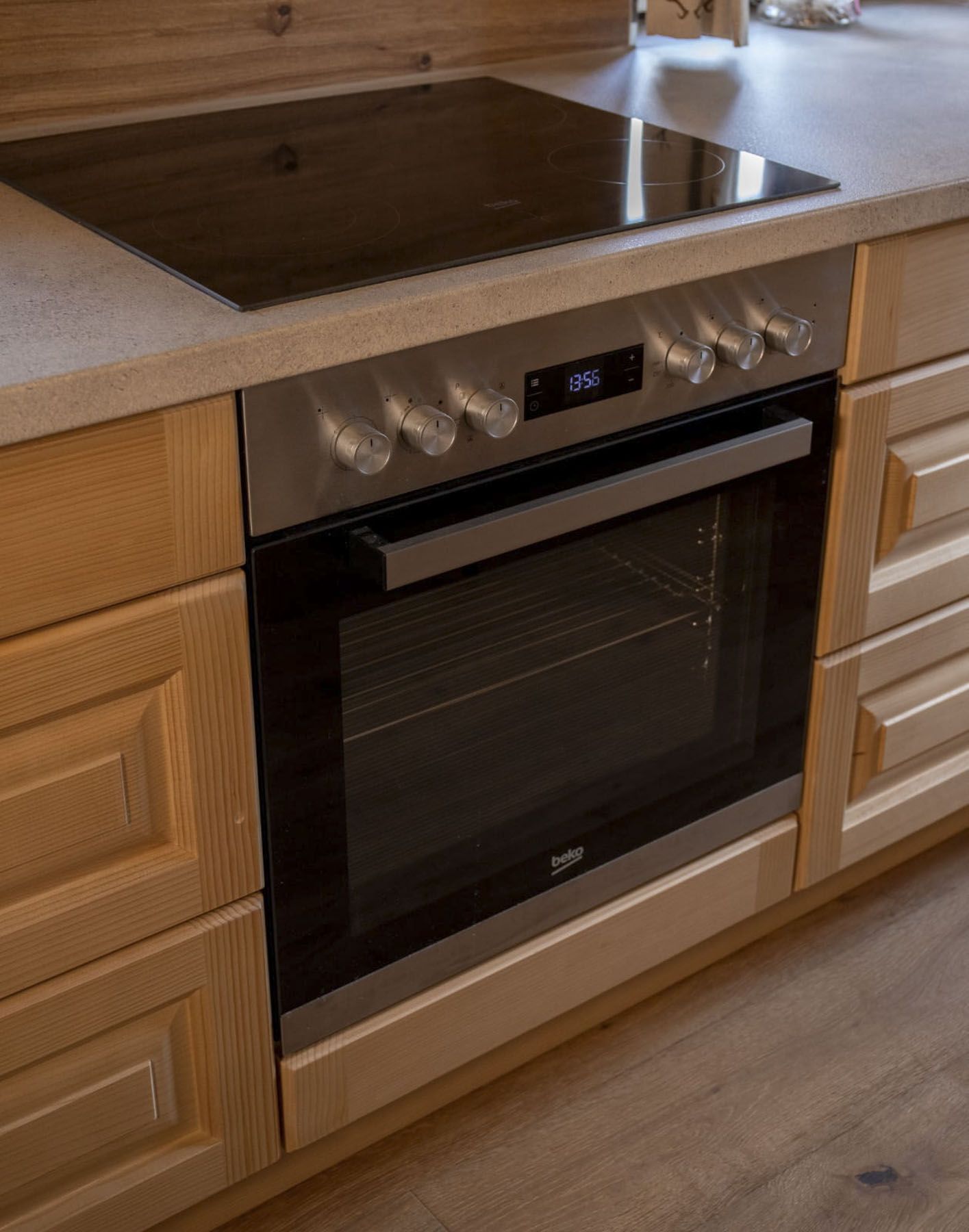 Holzofenherd und Elektroherd, Backofen, Geschirrspüler, Kaffeevollautomat, Kühlschrank mit Gefrierfach, Wasserkocher und Standmixer